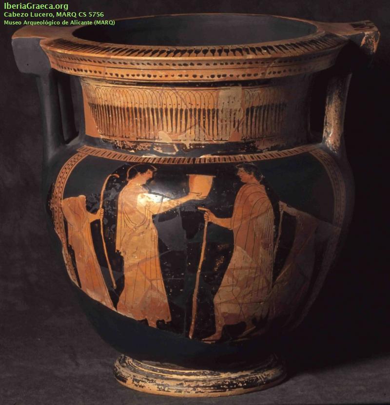 Origen : Ática Técnica : C. de figuras rojas Forma : Cratera de columnas Parte Conservada : Perfil completo Autor/Taller : FLORENCE P DECORACIÓN
