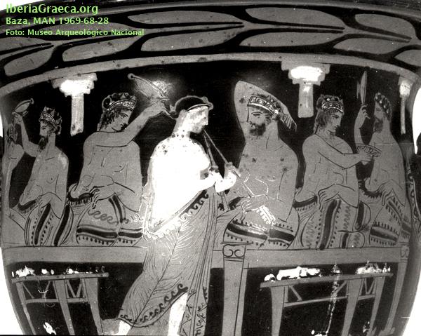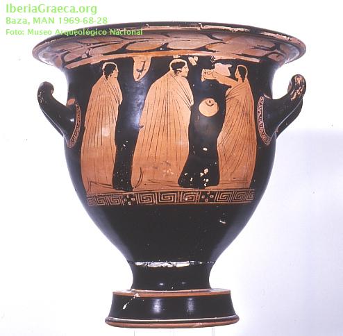 Origen : ÁticaTécnica : C. de figuras rojasForma : Cratera de campanaParte Conservada : Perfil completoAutor/Taller : ENOMAO PDECORACIÓN