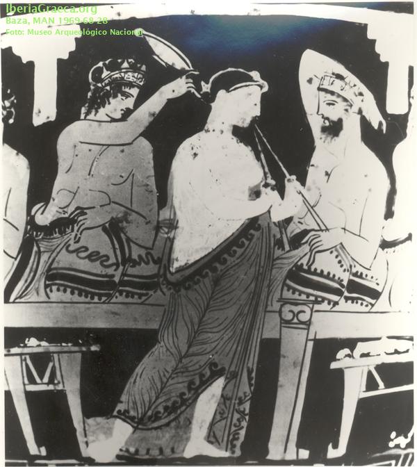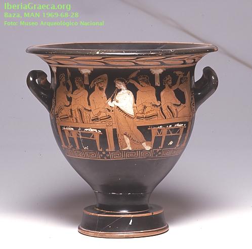 | Tipo Decoración : Pintada, Sobrepintada Escena : Banquete, Cotabos, Palestra Personajes : Simposiasta, Auletris, Joven, Erastés, Erómenos Elementos Secundarios : Alimentos, Aríbalo, Aulós, Capitel, Cojín, Copa, Corona, Disco, Elementos vegetales, Fuste, Kline, Manto, Patera, Trapeza Motivos Ornamentales : Rama de laurel, Ovas, Puntos, Greca de meandros y ajedrezado, Ramas