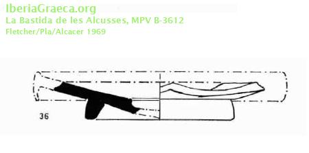 Observaciones : Además de este ejemplar aparecen, según FLETCHER/PLA/ALCACER 1969, p. 99: "Fragmento de pie y fondo de un posible plato de pescado, de cerámica ática de barniz negro, forma Lamboglia 23. Pasta gris-rojiza. (No se dibuja.) Longitud, 5'9 cms. Inventario B-3.676". Autor: Alejandra Macián (Universitat de València-EG) Supervisor: José Pérez Ballester (Universitat de València-EG) Fecha: 17-10-2018 |