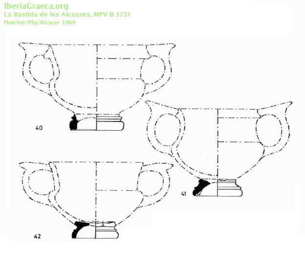 Observaciones : Fig. 40 - Inventario B-3731 Fig. 41 - Inventario B-3730 Fig. 42 - Inventario B- 3729. Además de estos ejemplares aparecen, según FLETCHER/PLA/ALCACER 1969, p. 99: "Tres fragmentos de pies de kráteras áticas de barniz negro, forma 40 (No se dibujan.) Inventario B-3.732 a 3.734". Autor: Alejandra Macián (Universitat de València-EG) Supervisor: José Pérez Ballester (Universitat de València-EG) Fecha: 17-10-2018 |