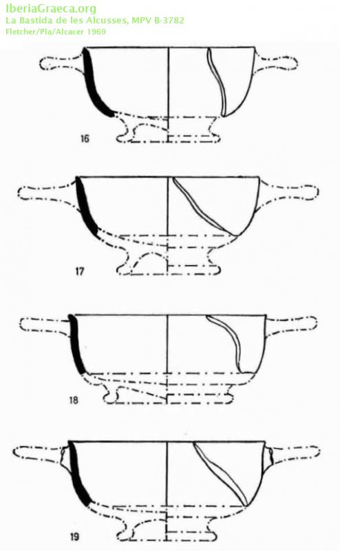 Observaciones : Fig. 16 - B-3.783 Fig. 17 - B-3.784: Fig. 18 - B-3.782 Fig. 19 - B-3.782. Además de estos ejemplares aparece, según FLETCHER/PLA/ALCACER 1969, p. 116: "(Un) Fragmento de pared de vaso de cerámica ática de barniz negro compacto muy brillante, de excelente calidad. Posiblemente se trata de un kylix forma 42 B. (No se dibuja.) Inventario B-3.786". Autor: Alejandra Macián (Universitat de València-EG) Supervisor: José Pérez Ballester (Universitat de València-EG) Fecha: 18-10-2018 |