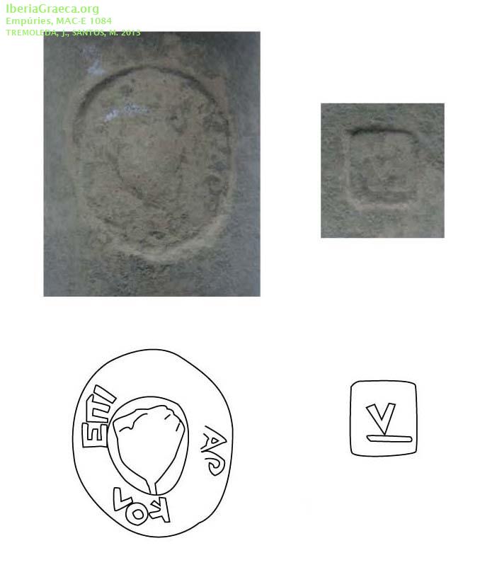 Observaciones : Según Tremoleda/Santos 2013: "Sello circular de rosa central con inscripción,de 28 mm. de diámetro y letras de 4 mm. Se trata del nombre del magistrado rodio en genitivo, precedido de la preposición EPI, seguido probablemente del nombre del mes rodio 5. Hay un sello secundario, en una cartela cuadrangular simple, de 11 por 13 mm., con un símbolo diminuto en el interior, que podría ser la letra kappa, que mide 6 mm". La clasificación tipològica ha sido realizada con la consulta en linea del estado actual del banco de datos de DICOCER (M. Py, coord.): http://www.syslat.fr/SLC/DICOCER/d.index.html Autor: Conxita Ferrer (CIG) Supervisor: Xavier Aquilué (CIG) Fecha: 24-10-2018 |
