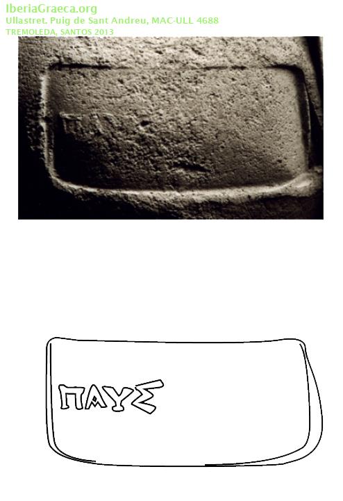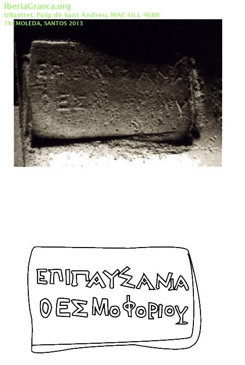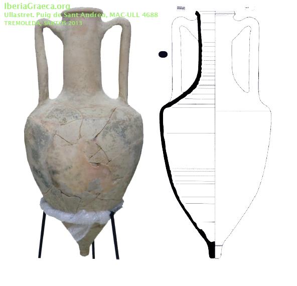 Observaciones : Ánfora de la forma IV (GRACE 1979) que presenta un cuerpo con un perfil triangular y alargado, con una espalda bastante bien marcada, un cuello largo y cilíndrico con un borde redondeado. El pivote es casi cilíndrico y macizo. La pieza contiene dos asas que se levantan por encima del nivel de arranque y, en la parte superior de cada asa, presenta dos sellos rectangulares estampillados con epigrafía griega, que se relaciona con el nombre del epónimo de la ciudad en el momento de la fabricación. Uno de los sellos presenta una cartela rectangular de 25 x 15 mm. El segundo también de cartela rectangular de 30 x 15 mm con el contenido parcialmente perdido. Autor: Mikel Soberón (CIG) Supervisor: Xavier Aquilué (CIG) Fecha: 31-10-2018 |