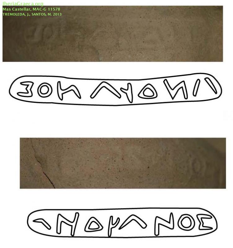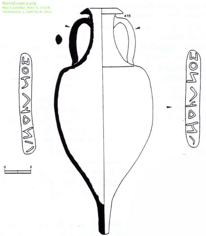 Observaciones : Según Tremoleda/Santos 2013: “La pieza procede del silo 101, UE-406, 1 (V), excavado en el año 1992. Presenta dos cartelas rectangulares con los extremos ovalados, letras en relieve de lectura retrograda. Miden 100 x 10 mm. Y 63 x 8 letras entre 6 y 10 mm". La clasificación tipològica ha sido realizada con la consulta en linea del estado actual del banco de datos de DICOCER (M. Py, coord.): http://www.syslat.fr/SLC/DICOCER/d.index.html Autor: Conxita Ferrer (CIG) Supervisor: Xavier Aquilué (CIG) Fecha: 31-10-2018 |