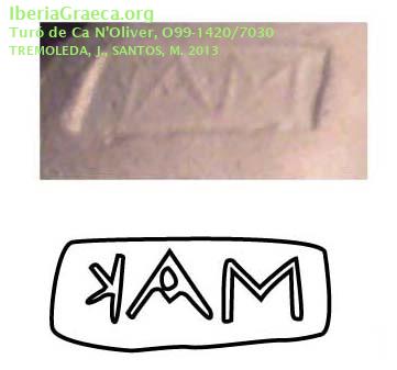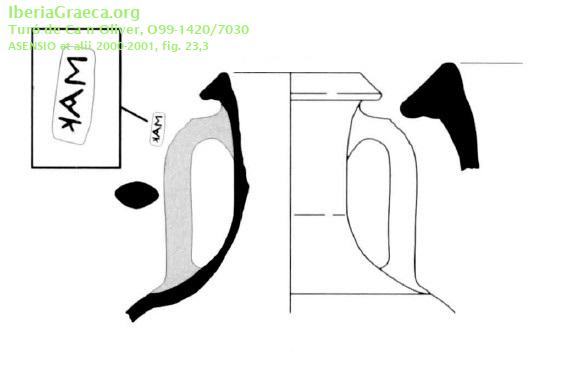 Observaciones : Parte superior de ánfora grecoitálica que se puede atribuir al tipo C de la clasificación de Lyding-Will (LYDING-WILL 1982). Según Tremoleda/Santos 2013: “La pieza apareció en un nivel de la fase 3, fechada entre 230-200 a.C. El sello esta impreso en la parte superior de un asa, con cartela rectangular de 23 x 9 mm. con letras de 5 mm". Autor: Conxita Ferrer (CIG) Supervisor: Xavier Aquilué (CIG) Fecha: 31-10-2018 |