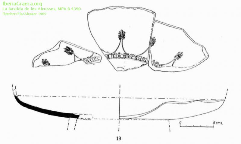 Observaciones : Además de este ejemplar aparecen, según FLETCHER/PLA/ALCACER 1969, p. 254: "Dos fragmentos de fondo de pátera, semejante a la anterior, conservando parte de una zona de trazos verticales paralelos, a lo ruedecilla, atravesados por línea incisa, y porción superior de una palmeta, todo ello en su fondo interno. (No se dibuja.) Inventario B-4.374 y 4 .375". Autor: Alejandra Macián (Universitat de València-EG) Supervisor: José Pérez Ballester (Universitat de València-EG) Fecha: 07-11-2018 |