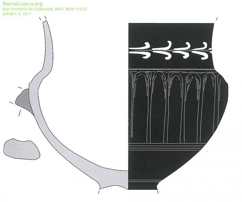 Observaciones : Probablemente del taller de las Tres Palmetas Radiales. Decoración de gallones verticales delimitados por incisiones ante coctionem. El cuello es liso, con decoración de una cenefa de motivos vegetales pintada de color blanco dispuesta bajo una línea incisa post coctionem. Las piezas de las fichas nº CIG 11822 y nº CIG 11823 tienen el mismo número de inventario al MAC-BCN: MAC BCN-11635. Autor: Conxita Ferrer (CIG) Supervisor: Xavier Aquilué (CIG) Fecha: 02-08-2022 |