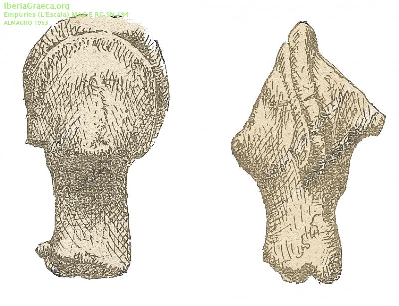 Descripcion : Cabeza de terracota perteneciente a una figura femenina perdida. Muestra deterioro sin que permita definir más detalles. Se observa el cabello recogido en la parte posterior con gorro cónico. Mide 55 mm de altura. Observaciones : Hallada en la tumba de incineración número 72 de Les Corts como ajuar funerario junto con otras cinco cabezas de tamaño similar (CIG 12414, 12415, 12416, 12417, 12418). Su procedencia atribuida a talleres magno-griegos no es segura. Autor: Xavier Font (CIG) Supervisor: Xavier Aquilué (CIG) Fecha: 12-12-2023 |
