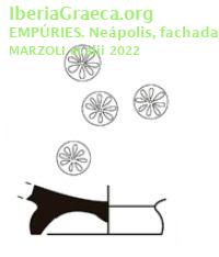 Observaciones : Cuenco de perfil curvilíneo de la forma Roses 11 (PUIG/MARTIN 2006) con cuatro impresiones circulares con rosetas de relieve en el fondo interno. Imita la decoración de las copas similares de la producción de los talleres itálicos llamados de las Pequeñas Estampillas. Hallado en los niveles de relleno del pozo de la fachada marítima (sector playa del Moll Grec) de la Neápolis de Empúries. Autor: Conxita Ferrer (CIG) Supervisor: Xavier Aquilué (CIG) Fecha: 08-08-2024 |