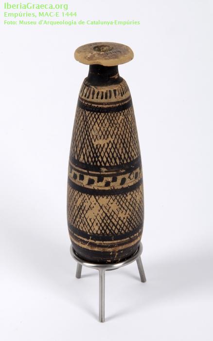 Origen : Ática Técnica : C. de figuras negras Forma : Alabastron Parte Conservada : Perfil completo Autor/Taller : EMPORION P group DECORACIÓN