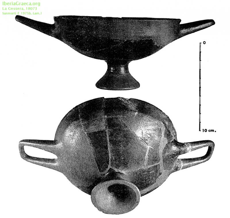 Observaciones : Posiblemente se trate de una pieza etrusca. Pieza restaurada a base de 13 fragmentos. 200mm diametro de boca, 100mm de altura, 54mm de profundidad del recipiente. Sanmartí lo compara al kylix de Coll del Moro. La presencia del cáliz de origen etrusco le resulta sugerente al autor, puesto que no se tenían noticias de nada parecido en la costa peninsular. Exportado mediante acción comercial focea, sin descartar comercio púnico desde Ibiza. Cela, Noguera, Rovira 1999: Etrusco Autor: Faustino Pérez Moracho (ICAC) Supervisor: M. T. Miró (Generalitat de Catalunya) Fecha: 25-10-2011 |