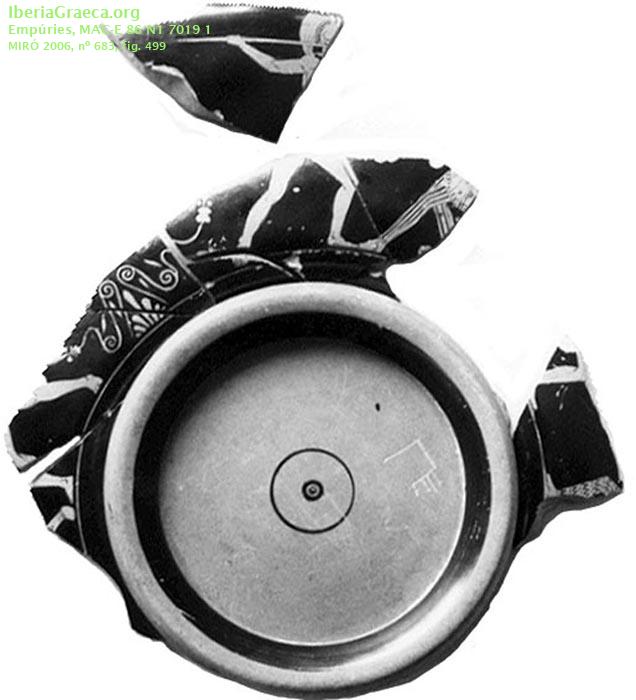 Observaciones : Guirlanda sobrepintada en blanco al interior, bajo el labio. Según DE HOZ GARCÍA BELLIDO 2014, dos grafitos incisos, uno de marca de mercader (Y) y el otro de abreviatura del nombre de mercader o propietario (ΠE). Autor: Marta Santos (MAC-Empúries) Supervisor: Xavier Aquilué (CIG) Fecha: 11-08-2008 |