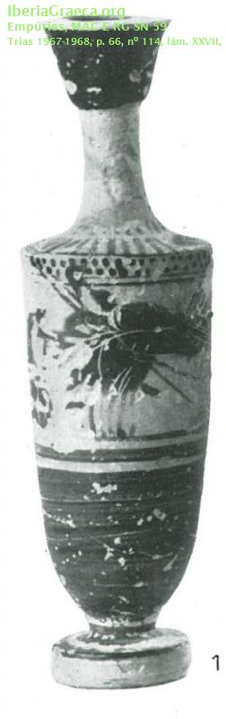 Uso secundario : Ajuar funerario Observaciones : Reconstruido, superficie desconchada. El ajuar de esta tumba estaba formado por tres lecitos (CIG 4531, 4534 y 4674), y un alabastron (CIG 4739) áticos de figuras negras, dos vasos de cerámica gris emporitana, un anillo y un pendiente de plata. Autor: Pol Carreras (CIG) Supervisor: Xavier Aquilué (CIG) Fecha: 31-01-2014 |