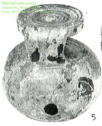 Uso secundario : Ajuar funerario Observaciones : Superficie muy desgastada, barniz casi perdido por completo. Según TRIAS 1967-68, pertenece al "numerosísismo grupo de los Guerreros. Cfr. los del Ashmolean Museum de Oxford". Autor: Pol Carreras (CIG) Supervisor: Xavier Aquilué (CIG) Fecha: 20-02-2014 |