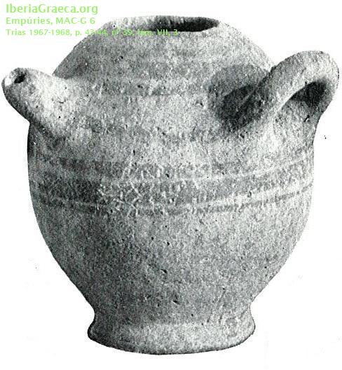 Uso secundario : Ajuar funerario? Observaciones : Según TRIAS 1967-68, también podría ser una imitación local. No es segura su procedencia de una necrópolis. Autor: Pol Carreras (CIG) Supervisor: Xavier Aquilué (CIG) Fecha: 25-02-2014 |
