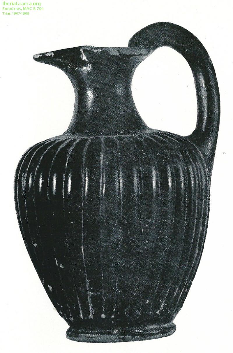 Origen : Ática Técnica : C. de barniz negro Forma : Enócoe de boca trilobulada Parte Conservada : Perfil completo DECORACIÓN
