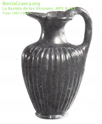 Origen : Ática Técnica : C. de barniz negro Forma : Enócoe de boca trilobulada Parte Conservada : Perfil completo DECORACIÓN
