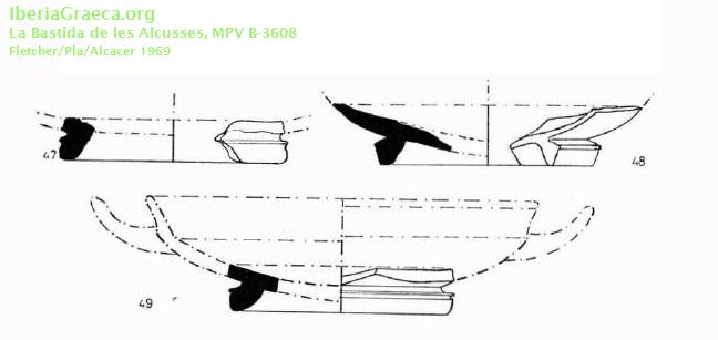 Observaciones : Fig. 47 - Inventario B-3608 Fig. 48 - Inventario B-3605 Fig. 49 - Inventario B- 3706. Además de estos ejemplares aparecen, según FLETCHER/PLA/ALCACER 1969, p. 101: "Siete fragmentos de pies de kylikes áticas de barniz negro. Forma 42 A. (No se dibujan.) Inventario B- 3.707 a 3.713". Autor: Alejandra Macián (Universitat de València-EG) Supervisor: José Pérez Ballester (Universitat de València-EG) Fecha: 17-10-2018 |