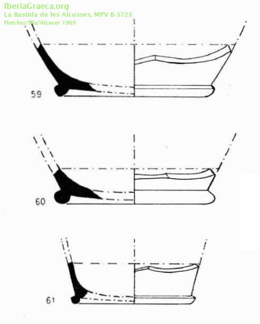 Observaciones : Fig. 59 - Inventario B-3723 Fig. 60 - Inventario B-3724 Fig. 61 - Inventario B- 3725. Además de estos ejemplares aparecen, según FLETCHER/PLA/ALCACER 1969, p. 103: "Tres fragmentos de fondos de skyphos áticos de barniz negro. Forma 43. (No se dibujan.) Inventario B-3.726 a 3.728" y "Seis fragmentos de pies y bases de skyphos áticos de barniz negro, de forma 43, o de kylix de pie muy bajo, forma 42 B. (No se dibujan.) Inventario B-3.715 a 3.719 y B-3.722". Autor: Alejandra Macián (Universitat de València-EG) Supervisor: José Pérez Ballester (Universitat de València-EG) Fecha: 18-10-2018 |