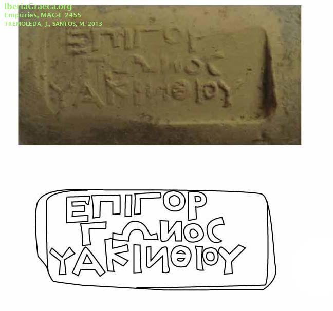 Uso secundario : Ajuar funerario Observaciones : Según Tremoleda/Santos 2013: “La pieza procede de la excavación de la incineración 104 de la necrópolis de Les Corts. Sello de cartela rectangular simple con inscripción dispuesta en tres líneas, de 40 por 20 mm. con letras de 4 mm. Sello muy bien conservado, con la preposición inicial EPI, el nombre del magistrado y el nombre del mes". La clasificación tipològica ha sido realizada con la consulta en linea del estado actual del banco de datos de DICOCER (M. Py, coord.): http://www.syslat.fr/SLC/DICOCER/d.index.html Autor: Conxita Ferrer (CIG) Supervisor: Xavier Aquilué (CIG) Fecha: 29-10-2018 |